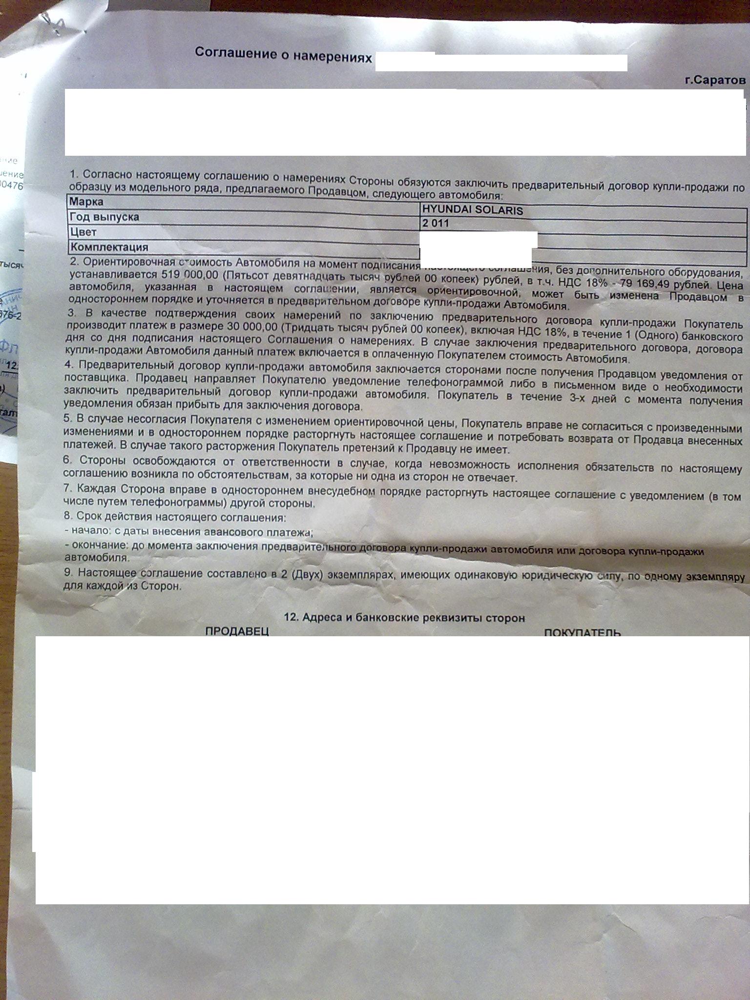 сочувствую, тот документ что Вы выложили имеет только 1-ну юридическую силу - это лишь расписка что салон принял от Вас 30000р. бессрочно безо всяких обязательств до первого требования возврата Ваших средств. Все оф. дилеры заключают сразу пред. договор поставки с оговоренными сроками поставки (правда оговаривая, как в моем случае что сроки могут быть продлены в одностороннем порядке, что является нарушением закона о пред договорах и может быть оспорено в суде), а соглашение о намерениях - это фикция.