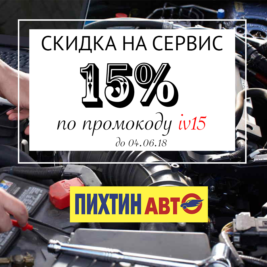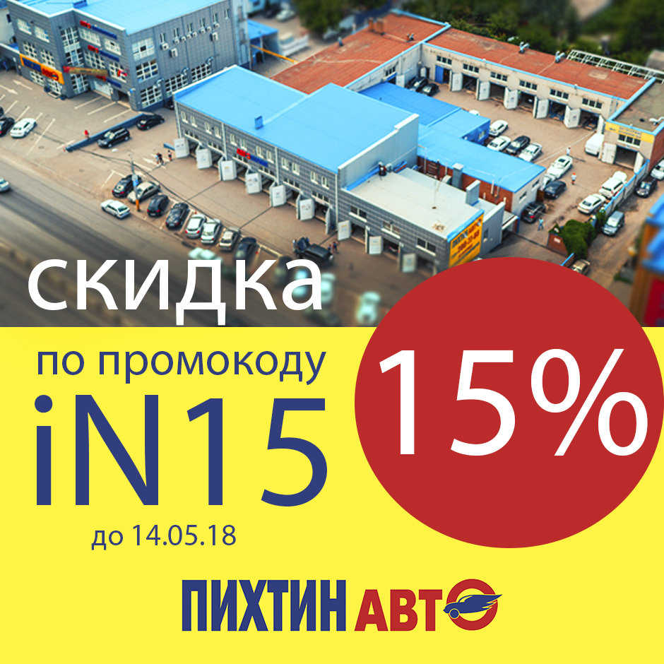Новый промокод на скидку 15 % в ПихтинАвто! Скидка распространяется на ремонт и обслуживание автомобилей в ПихтинАвто и на запчасти в наличии при обслуживании в нашем автосервисе. Для того что бы получить скидку сообщите менеджеру автосервиса промокод iN15! Получить дополнительную информацию и записаться на сервис Вы можете по телефону 863 200-77-88! Подписывайтесь на нас мы регулярно проводим акции и дарим скидки для подписчиков! Автокомплексы ПихтинАвто находятся на Малиновского 13А/1 и Нансена 156А! Скидка не суммируется с другими скидками и не распространяется на товары со спец. ценой.